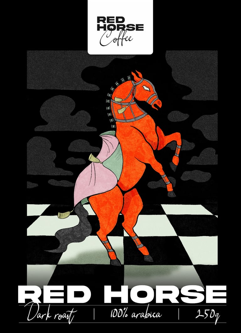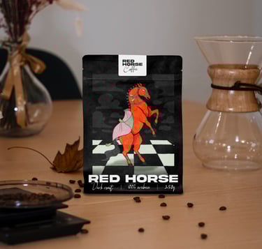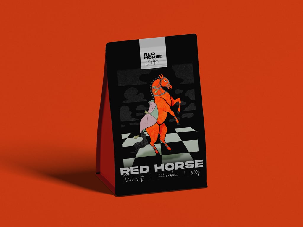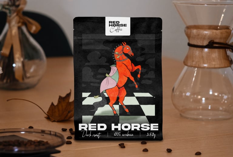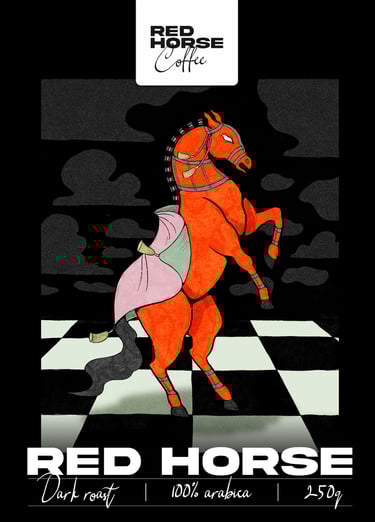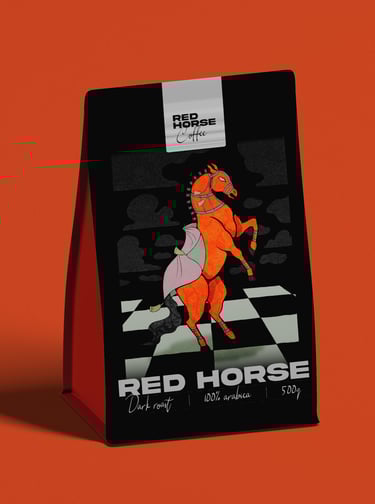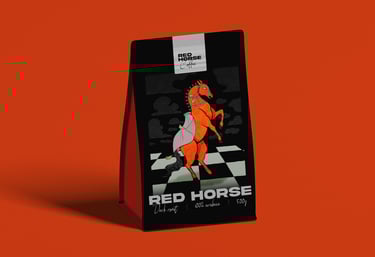 Pour Red Horse Coffee, j’ai conçu un packaging sur mesure qui reflète le caractère de la marque et joue avec humour sur l’énergie (et parfois l’énervement) que peut provoquer le café.